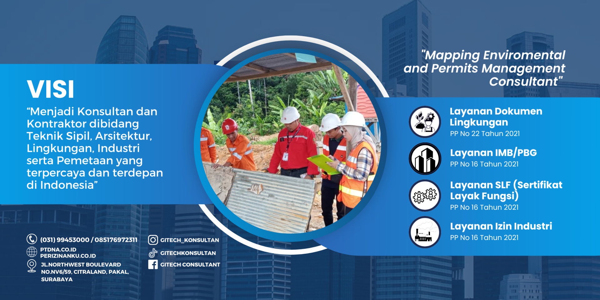 Kami adalah perusahaan yang bergerak di bidang Konsultan Perizinan. Kepuasan dan kebutuhan klien adalah prioritas kami. Kami bekerja dengan professional dan berorientasi dengan hasil yang terbaik. Layanan kami meliputi :